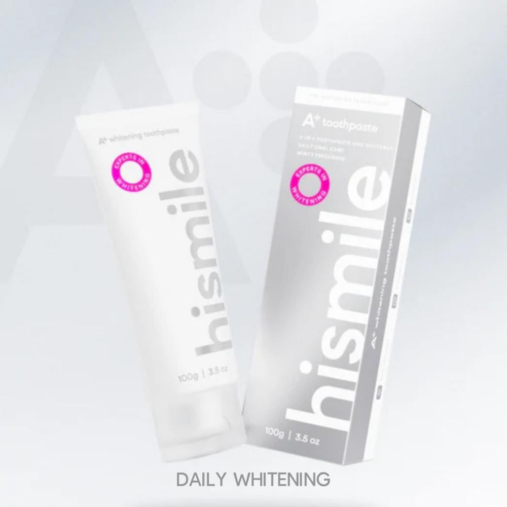Hismile’s A+ Whitening Toothpaste is your new daily essential for a bright, fresh smile. This minty formula gently lifts surface stains with a blend of whitening ingredients, keeping your teeth clean and healthy. It’s your simple solution for a confident, glowing smile - every single day.